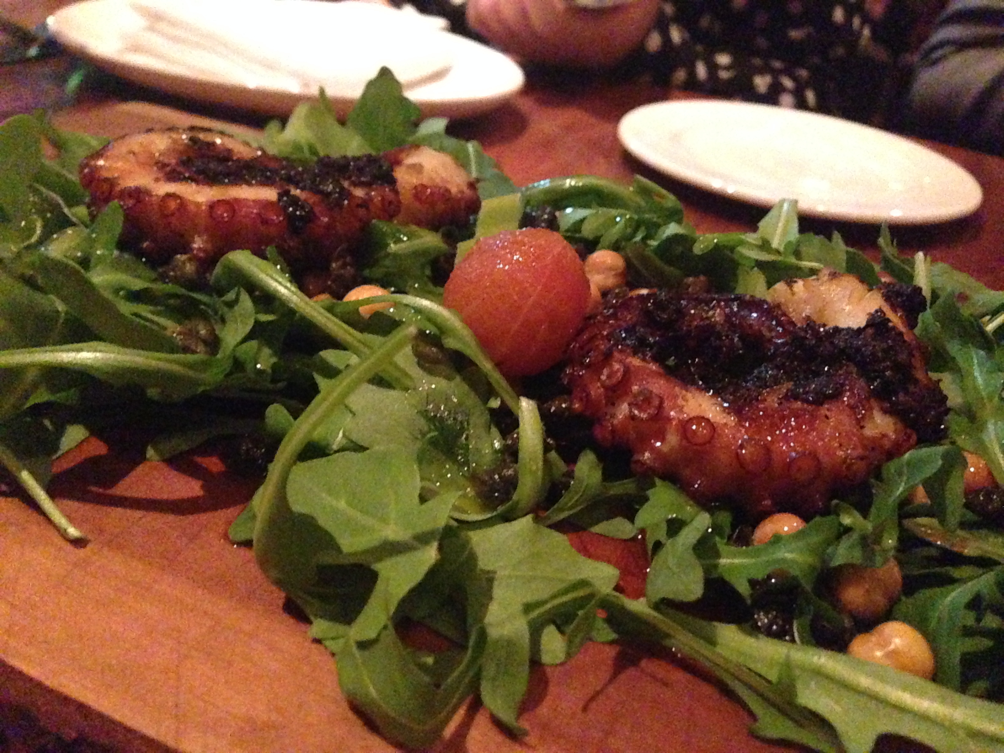 Polipo Grigliato – Grilled Octopus served on a bed of greens accompanied by Fried Chick Peas and a Black Olive Pesto.