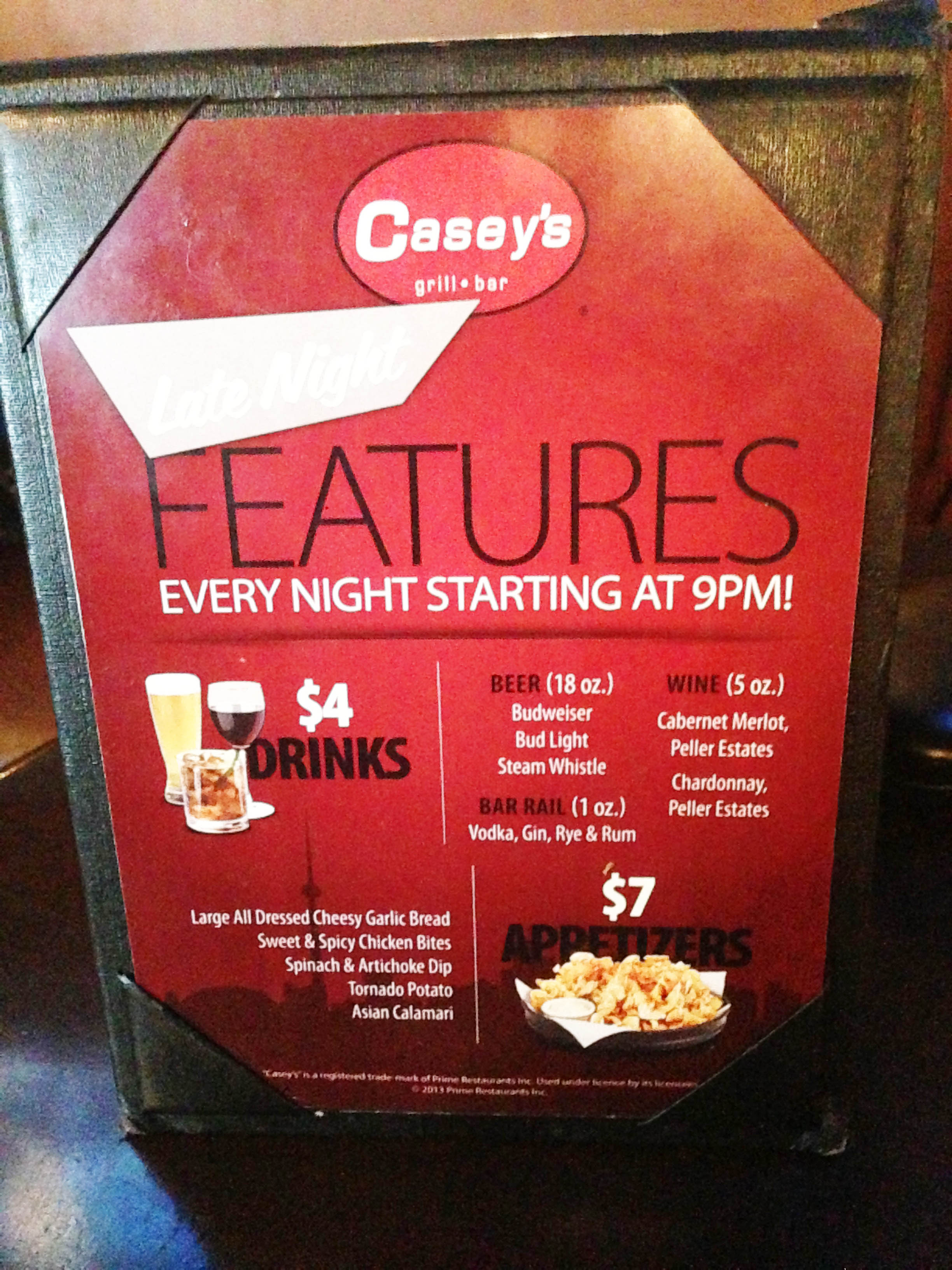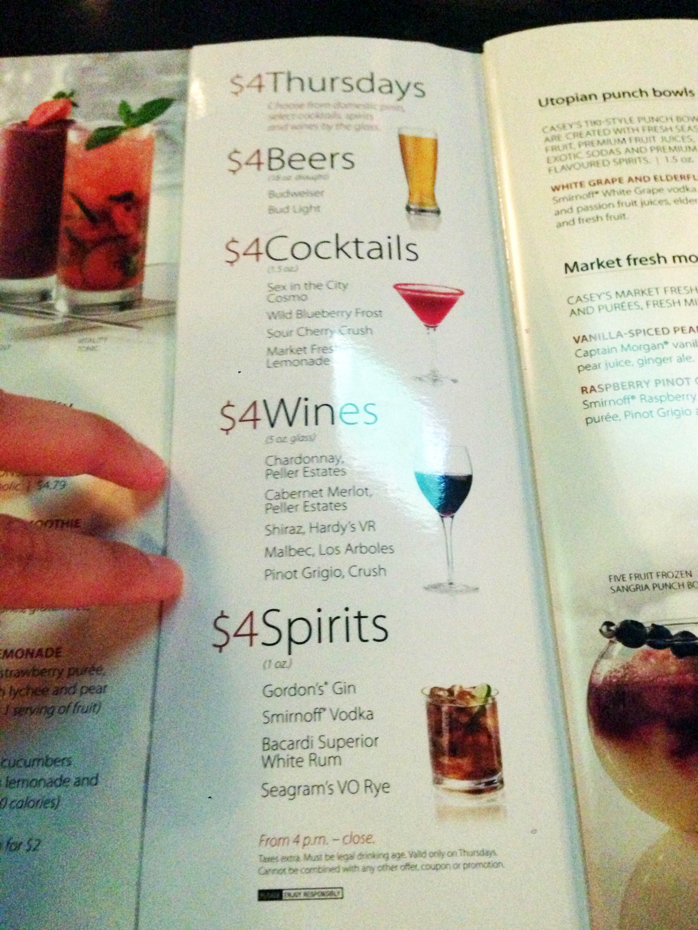 While at Casey’s I also noticed that they had some great specials to save you some money in the downtown core (and likely at all other locations). Thursdays seem to be the best day where they have $4 drinks from 4pm-close. Here are some shots I took of the menu with all of their great deals:
